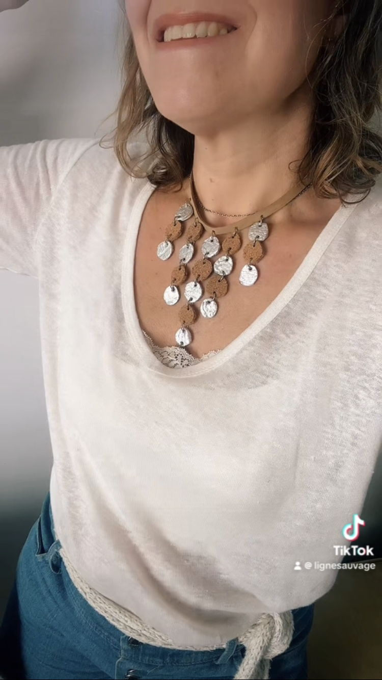 Bijou ethnique et élégant ! Ce collier en liège brut, associé à des touches argentées, allie parfaitement design contemporain et engagement écoresponsable.