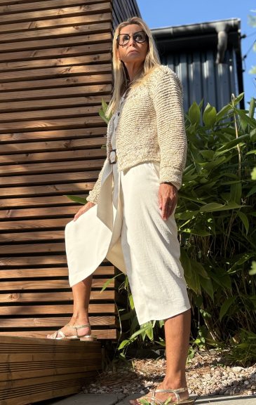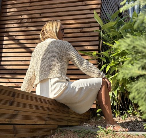 Le mélange de matières naturelles offre une texture à la fois rustique et douce, idéale pour la mi-saison. Ce gilet se porte facilement sur une robe fluide ou un pantalon taille haute pour un look à la fois chic et décontracté.