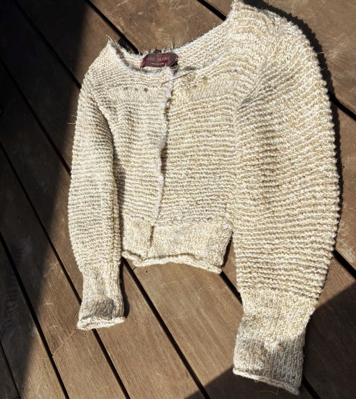 Ce bombers unique en maille est entièrement réalisé à la main de manière artisanale, avec le plus grand soin et une attention particulière aux détails. Il est tricoté avec un mélange noble de fil d’ortie, laine et fibre de bananier qui lui confèrent à la fois résistance, douceur et un aspect naturellement texturé.