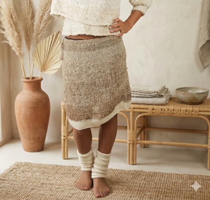 Une jupe mêlant maille et style ! Elles est réalisée avec des fibres écologiques, un vêtement proche de l’humain et de la nature.