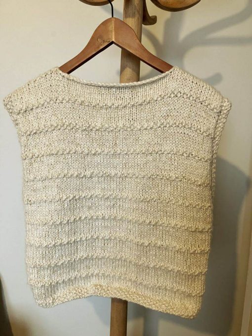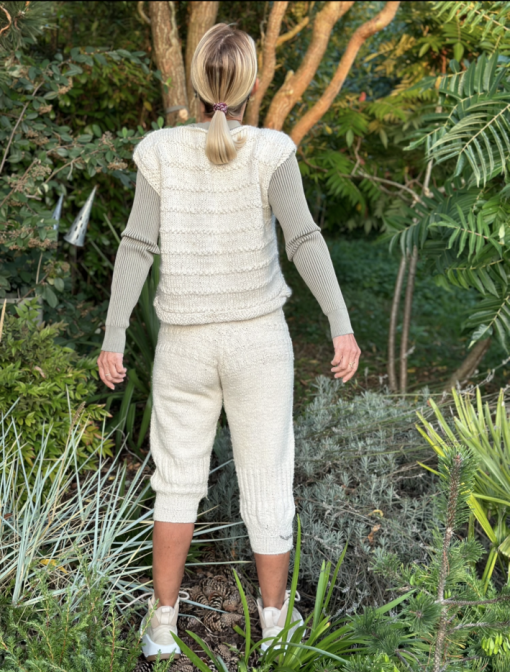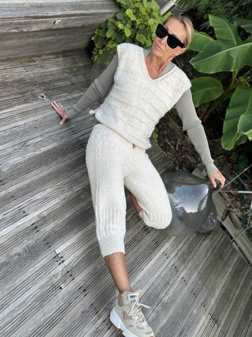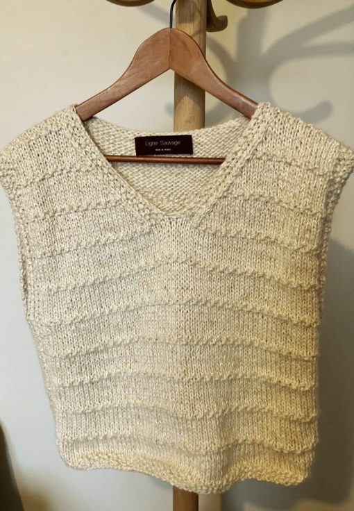 il est réalisé au tricot en France avec un mélange de laine, de soie et de chanvre.