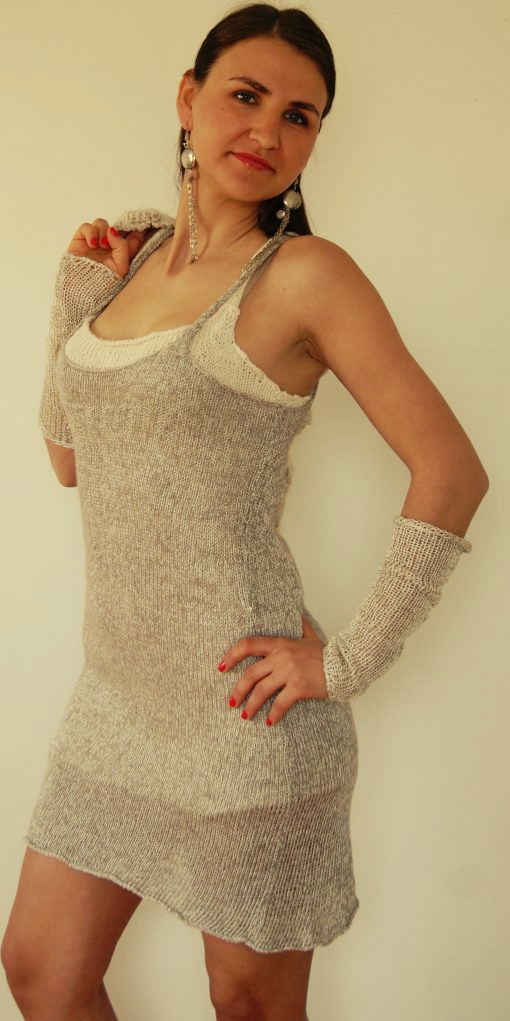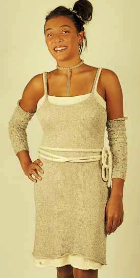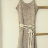 Cette robe double, l’une en 100 % coton brut, l’autre en soie fluide et lin.( 60 % soie, 40 % lin.) La ceinture est en coton brut.